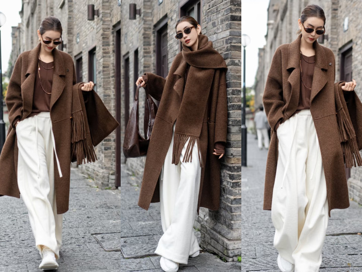 冬季穿大衣,选择同色系不同深浅搭配,或同色系不同材质组合,能轻松穿出和谐统一又高级造型。不管是穿白色系、灰色系、棕色系,都能穿出简约高级感。